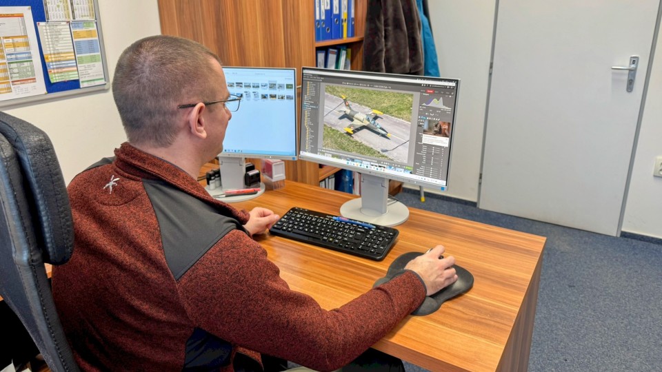 U snímků z hangáru nebo interiéru kabiny se často řeší horší světelné podmínky. Úprava expozice pomáhá vrátit detail do stínů i světlých částí.