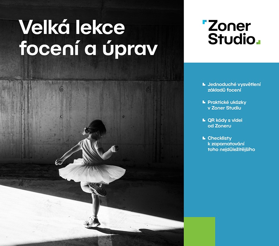 Teorie? Ano. Ale hlavně praxe. V knize najdete QR kódy s videonávody, které vás navedou krok za krokem přímo v Zoner Studiu.