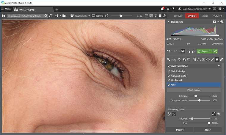 - vyrovná barevné přechody ale zachová strukturu kůže
